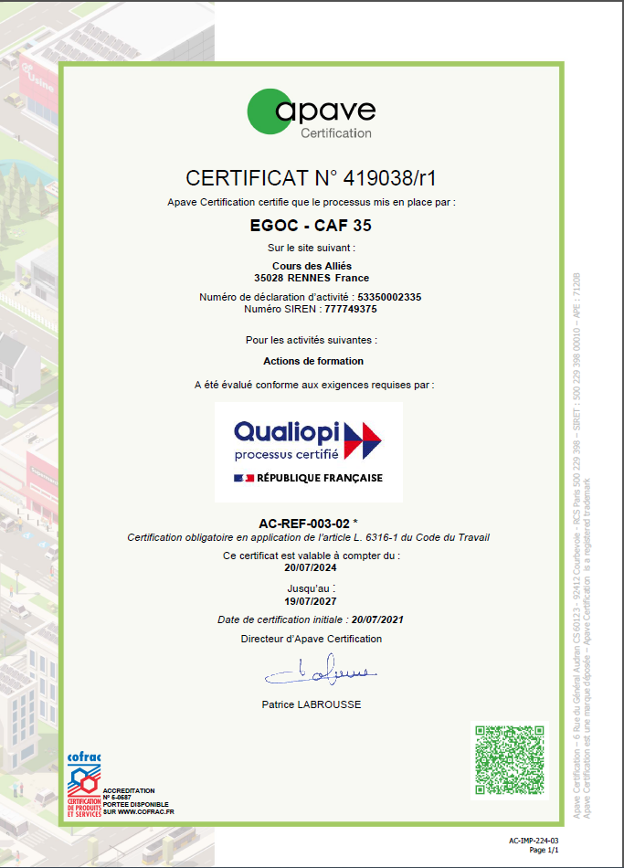 L'EGOC est une structure mutualisée de formation enregistrée sous le n°53350002335 auprès du Préfet de Région de Bretagne et sous le numéro SIRET 777749375 00021. Son organisme support est la Caf d’Ille et Vilaine, Caisse de rattachement administratif.