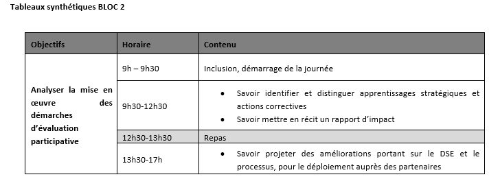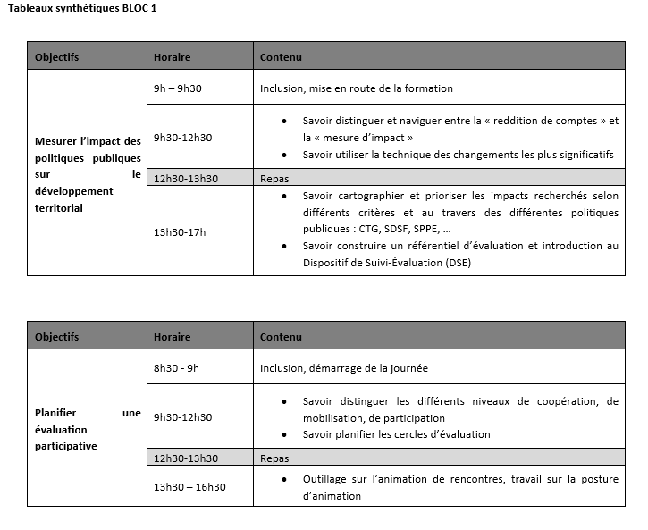 Le second bloc, programmé en avril 2026, s'appuie sur cette expérience pratique pour engager une analyse réflexive approfondie. L'objectif consiste à identifier et analyser les enseignements tirés de la mise en œuvre des démarches d'évaluation participative. Cette analyse permet de dégager les apprentissages stratégiques relatifs à l'impact des politiques publiques sur le développement territorial. Il s'agit de mieux comprendre comment les différents dispositifs portés par la CAF s'articulent avec les dynamiques locales et contribuent concrètement à la transformation des territoires.